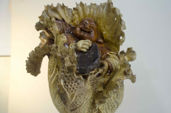 Tượng gỗ Di Lặc được chế tác theo hình tượng Bố Đại Hòa Thượng của Trung Quốc được cho là vị Phật thứ 5 sẽ xuất hiện trong tương lai và cũng là vị Phật cuối cùng của Phật Giáo.