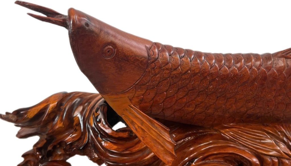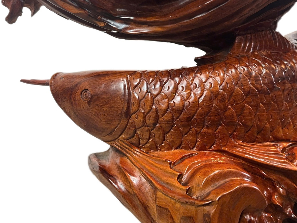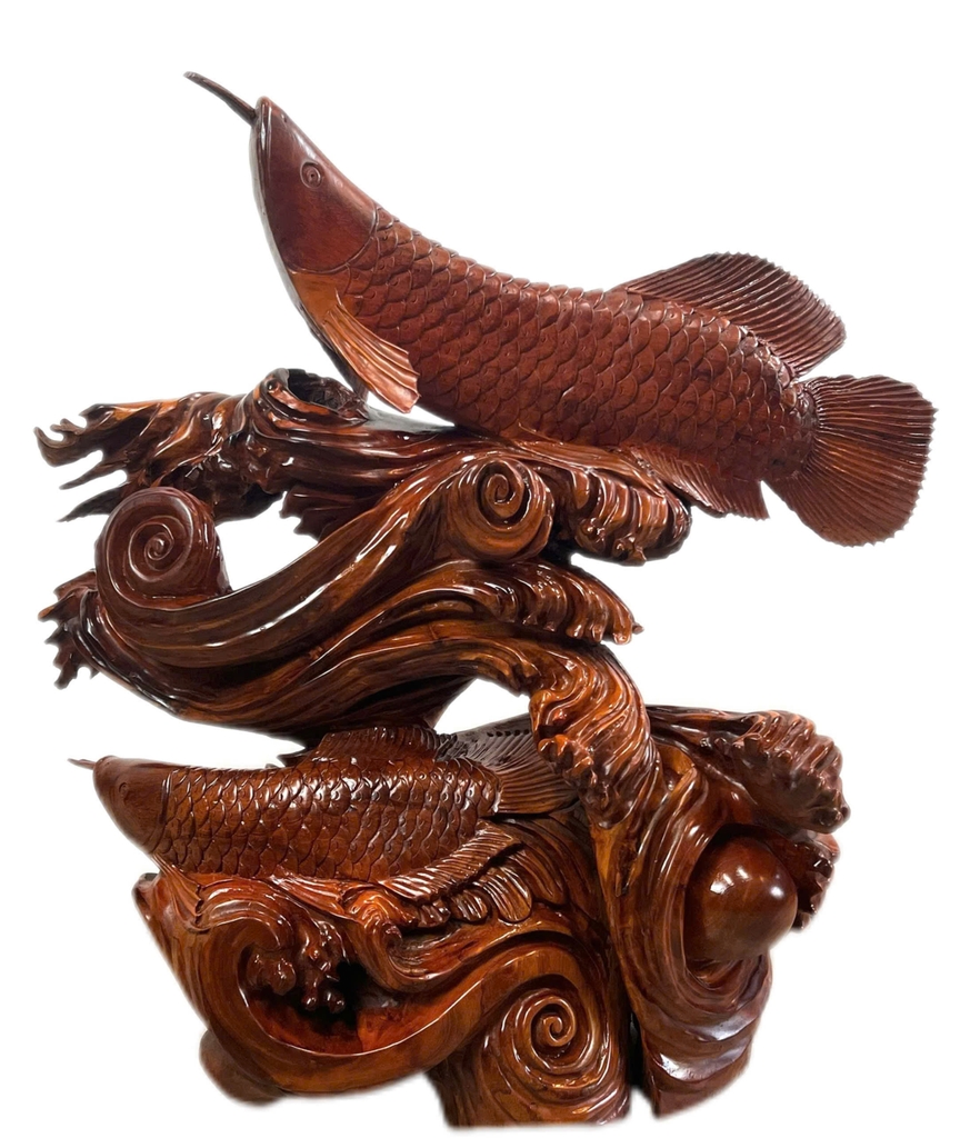 Tác phẩm được làm từ gỗ hương với màu gỗ nâu đỏ và vân gỗ rõ. Hình tượng đôi cá rồng, còn gọi là kim long, được chạm khắc đối xứng, từng chi tiết vảy và đuôi cá được thể hiện rõ nét. Trong phong thủy, cá rồng thường gắn liền với ý nghĩa may mắn, tài lộc và sự sung túc.