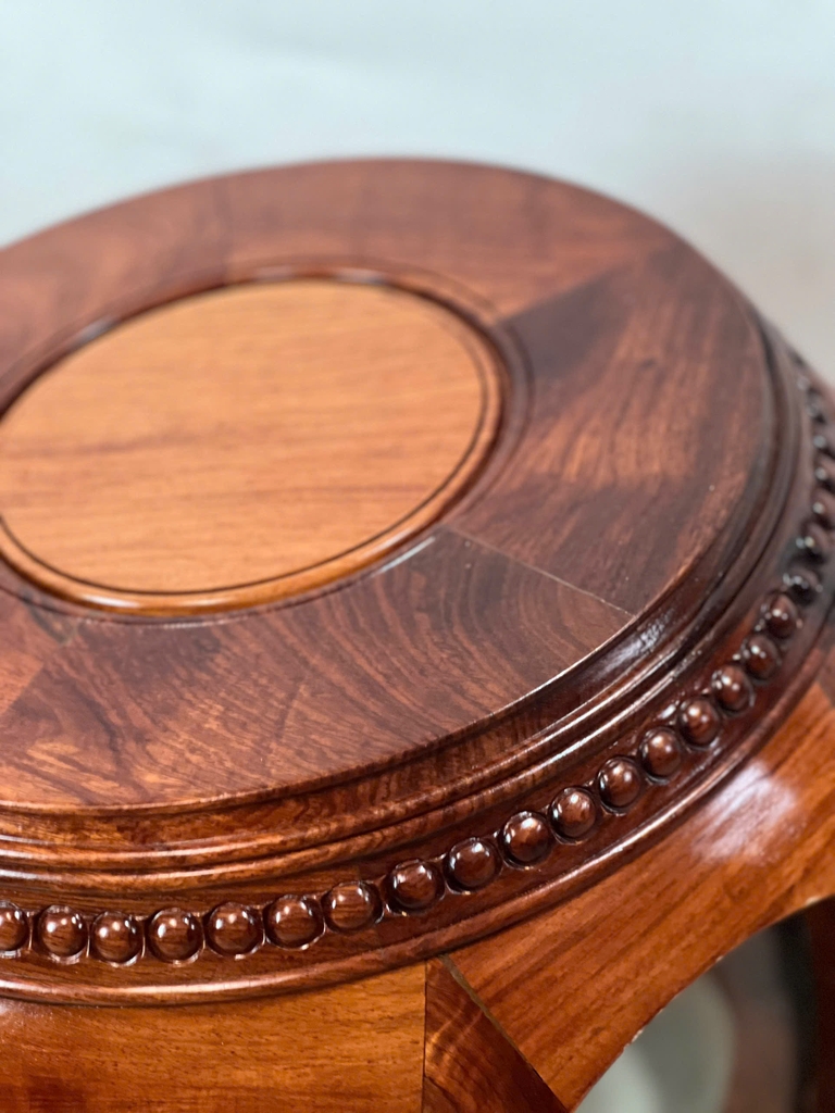 Đôn trống được làm từ gỗ hương, có màu sắc sang trọng, vân gỗ đẹp và mùi thơm dịu nhẹ đặc trưng. Kiểu dáng trống tròn vững chãi, phần mặt rộng, có thể dùng để trưng bày tượng gỗ, bình gốm, bình hoa hay các vật phẩm phong thủy. Đôn được chạm khắc thủ công tỉ mỉ, đường nét tinh tế, vừa chắc chắn vừa mang tính thẩm mỹ cao.