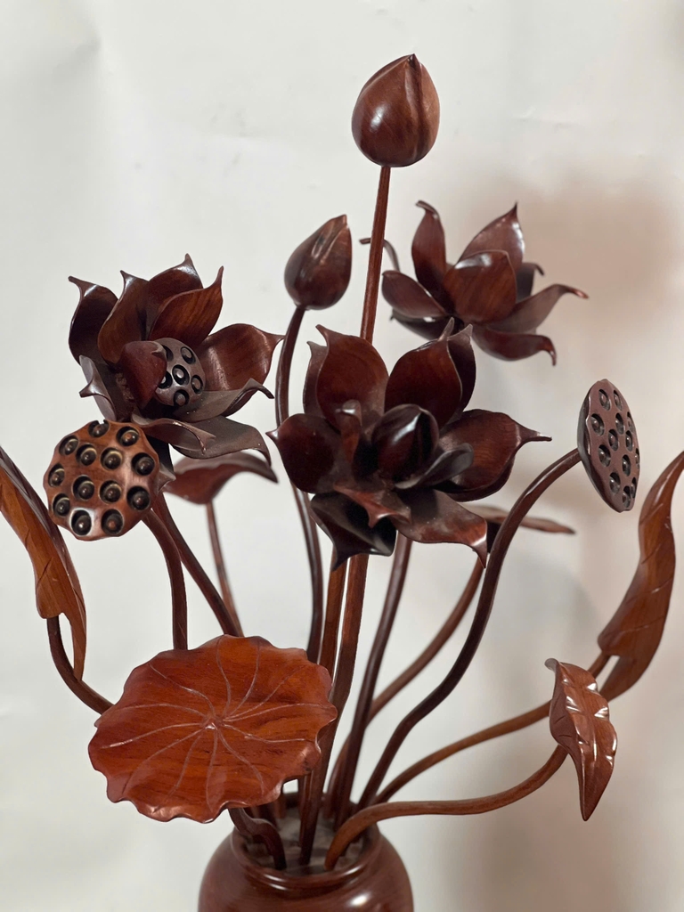Lọ hoa được chế tác từ gỗ hương tự nhiên, sắc gỗ trầm ấm, vân gỗ nổi đẹp mắt và có mùi thơm dịu nhẹ đặc trưng. Kiểu dáng thanh thoát, phần thân lọ bo tròn mềm mại, miệng loe cân đối, tôn lên sự tinh tế và sang trọng. Sản phẩm để trưng bày như một vật phẩm trang trí, mang lại vẻ đẹp hài hòa cho không gian.