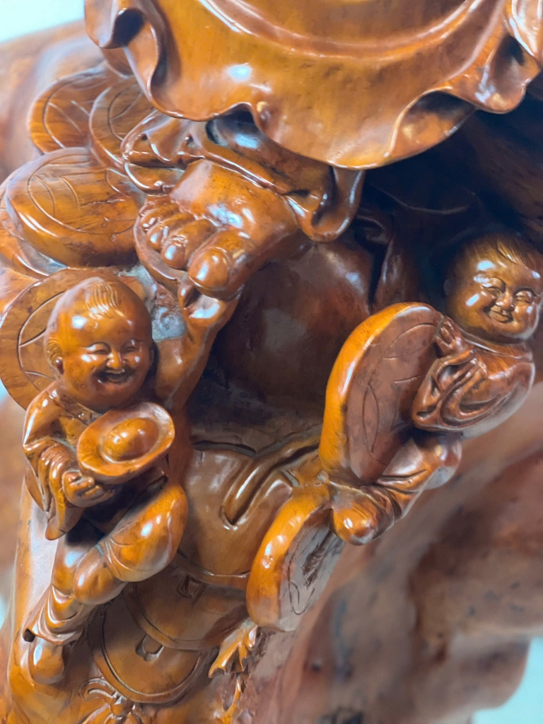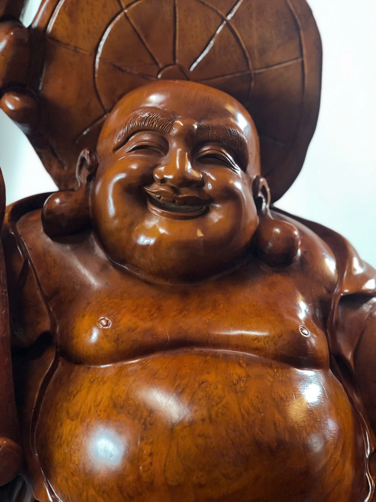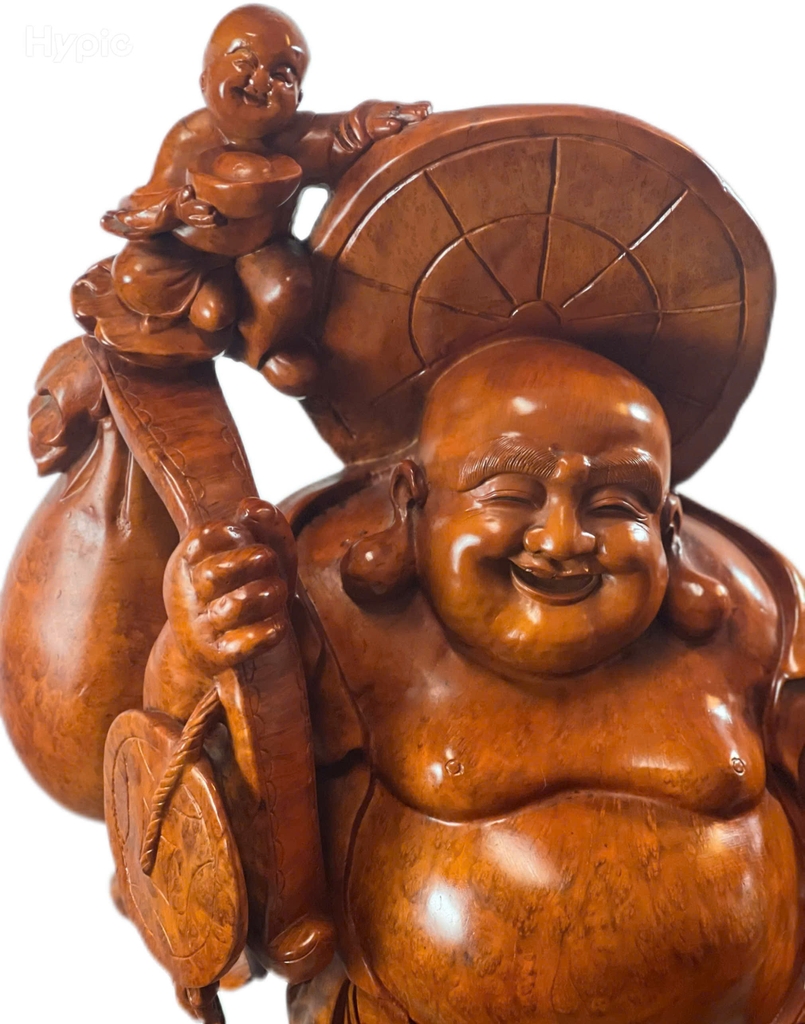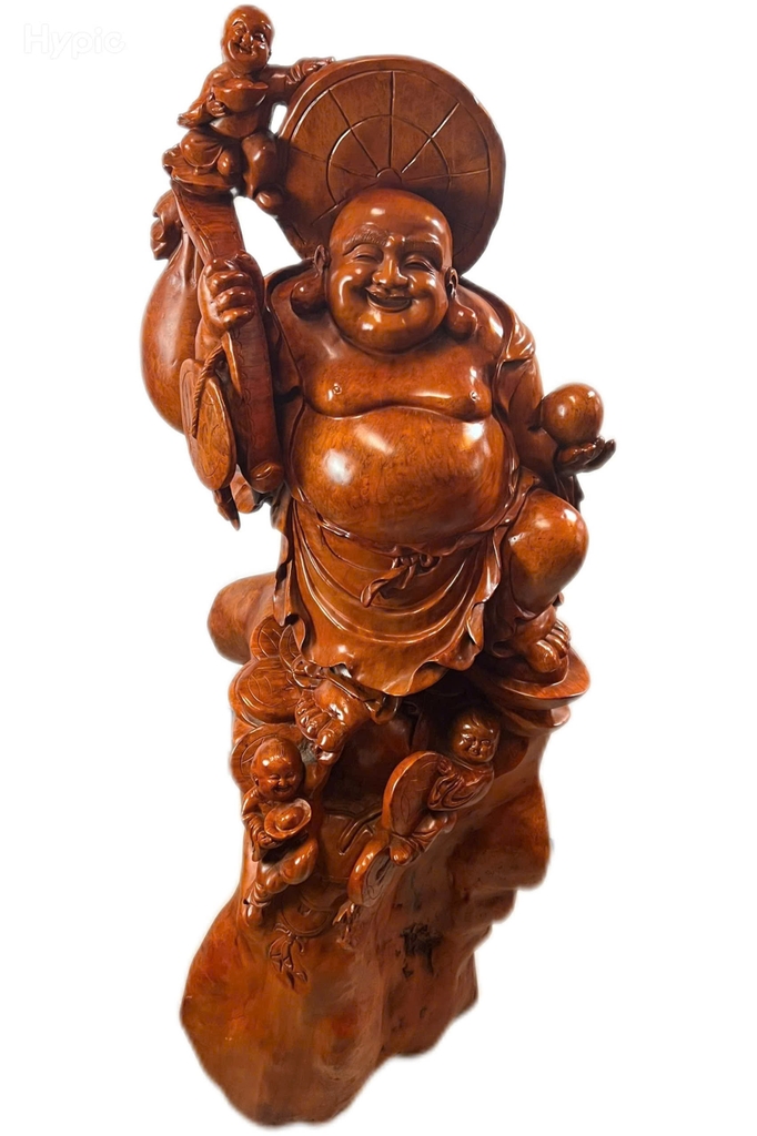 Tượng được chế tác từ gỗ Lu Kháo Đỏ nguyên khối, vân gỗ nổi bật, sắc đỏ tự nhiên sang trọng. Hình tượng Di Lặc Phúc Lộc Thọ được thể hiện sinh động với khuôn mặt hiền từ, nụ cười hoan hỷ, tượng trưng cho niềm vui và hạnh phúc. Ba ông Phúc – Lộc – Thọ bên cạnh biểu trưng cho con cháu sum vầy, tài lộc dồi dào và sức khỏe trường thọ. Từng chi tiết trên tượng đều được chạm khắc tinh xảo, hài hòa, tạo nên tổng thể cân đối và đầy ý nghĩa. Trong phong thủy, tượng Di Lặc Phúc Lộc Thọ mang lại sự may mắn, thịnh vượng, viên mãn và bình an cho gia chủ.