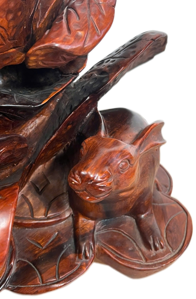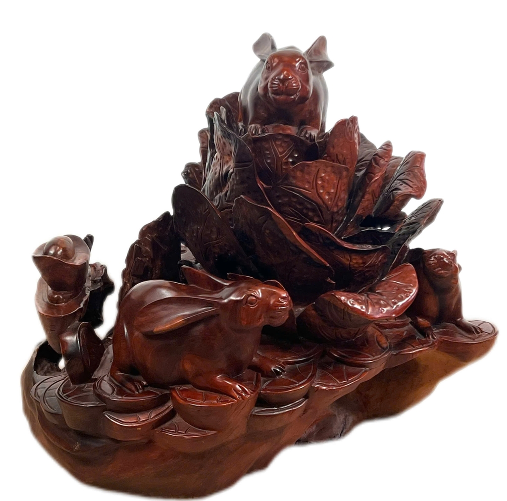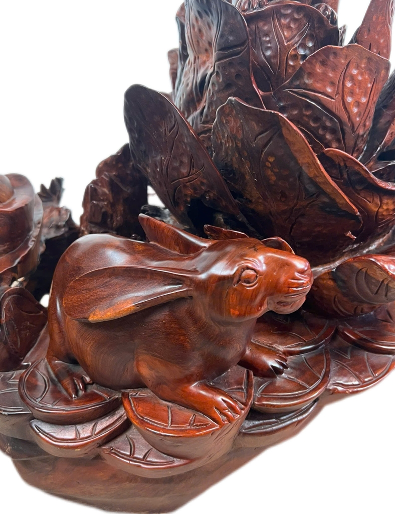 Tác phẩm được làm từ gỗ hương, màu nâu đỏ, vân gỗ rõ. Hình tượng chú thỏ được chạm khắc với dáng ngồi tự nhiên, các chi tiết tai, mắt và bộ lông thể hiện rõ. Trong văn hóa phương Đông, thỏ thường gắn với hình ảnh hiền lành, nhanh nhẹn và may mắn.